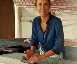 Son travail, fortement influencé par ses références textiles, l’a amenée à partir en quête de techniques artisanales traditionnelles, telles que l’impression à la planche (blockprint), le batik et la teinture (tie&dye) en Inde et en Afrique.